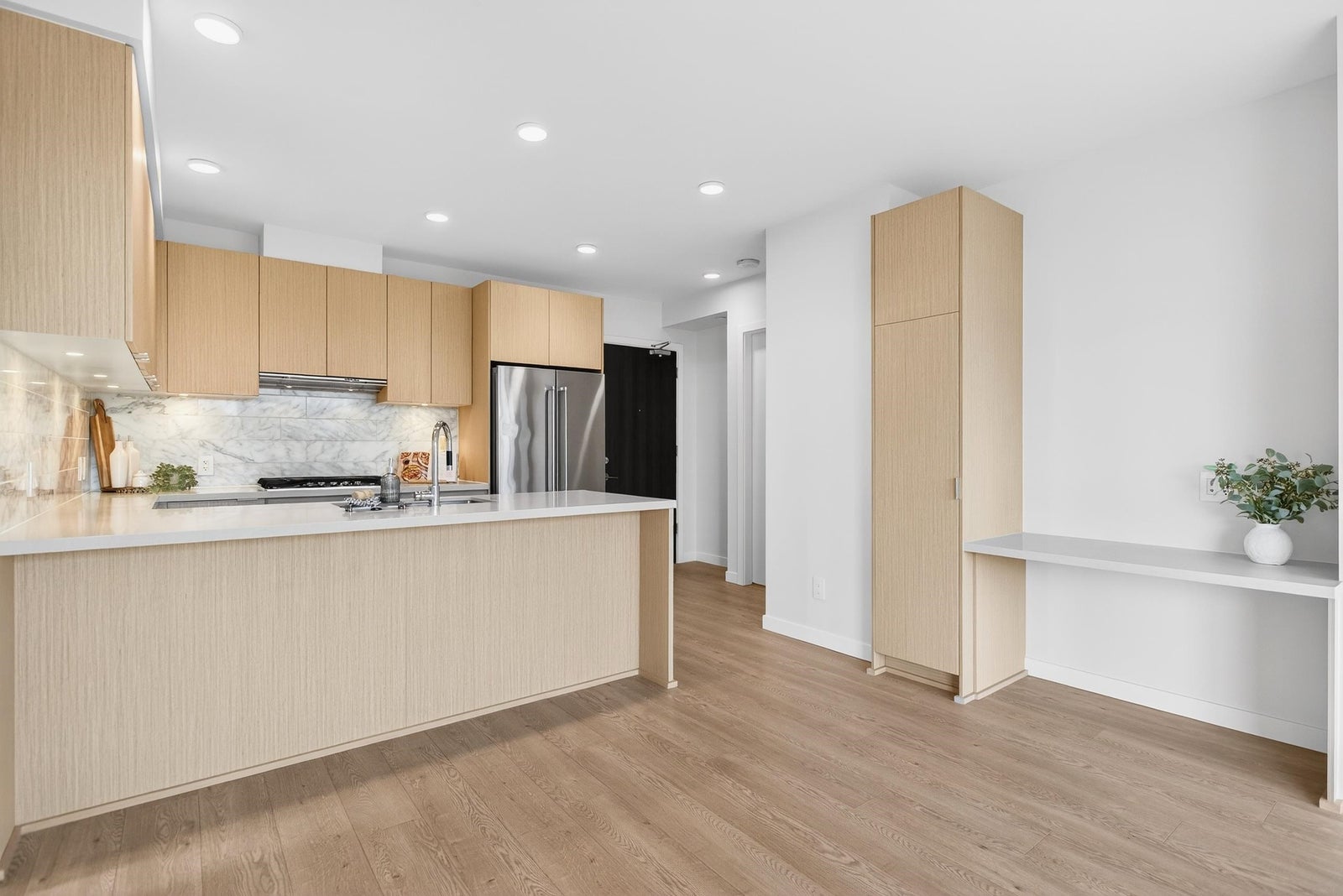 Inside, the open concept layout is filled with natural light from floor to ceiling windows, creating a warm and inviting atmosphere throughout the day. The modern kitchen is both stylish and practical, featuring quartz countertops, a gas cooktop, built in oven, and a large peninsula that works beautifully for everyday meals, entertaining, or helping kids with homework while you cook. The layout offers excellent bedroom separation, making it ideal for families, roommates, or those working from home. Both the main bathroom and ensuite have a clean, contemporary finish that adds to the home’s polished feel.
